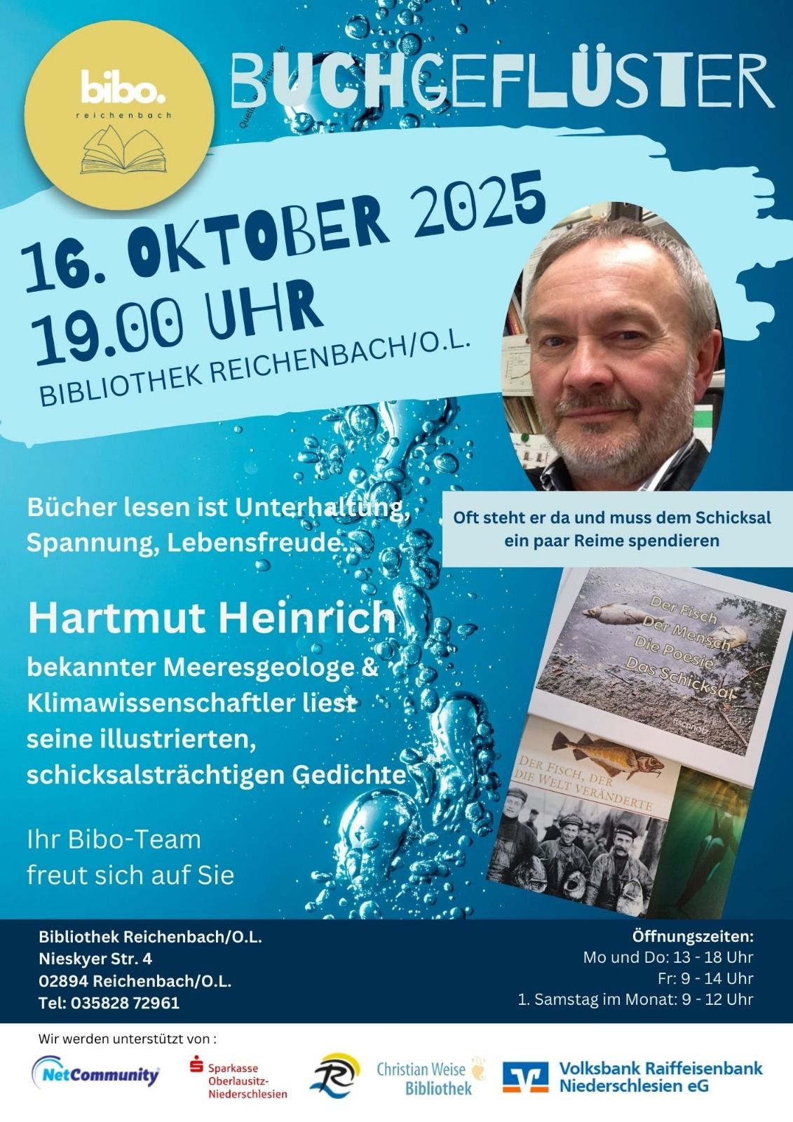 Bibliothek Reichenbach Nieskyer Str. 4, Reichenbach, Sachsen, GermanyEine Lesung der besonderen Art mit Hartmut Heinrich aus Hamburg. Seine Verbundenheit mit dem feuchten Milieu, sein Sternzeichen Fische und seine Begabung, Dinge zu sehen, die Andere nicht sehen, führt oft zu schicksalsträchtigen Erkenntnissen, die in unerwarteten Versen enden. Belebend und erfrischend wird dazu die Präsentation seiner Bilder sein.